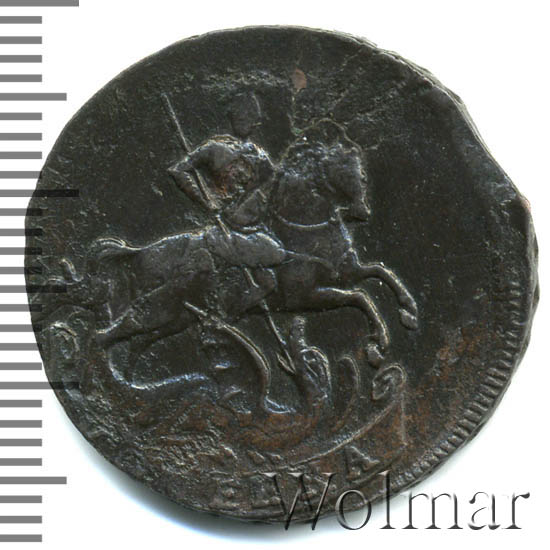 1 копейка 1761 годаДата выпуска: 01.01.1761 АверсВ центре — рельефное изображение Георгия Победоносца верхом на коне, поражающего копьём дракона. Внизу, под центральным изображением, полукругом располагается бандероль с обозначением номинала — «КОПЕИКА».РеверсВ центре изображён вензель императрицы Елизаветы I (Петровны). Над вензелем — императорская корона. По обеим сторонам от вензеля цифры даты выпуска монеты: слева — «17», справа — «61» (1761 год). Вокруг центрального изображения, вдоль канта, изображён венок из лавровой и пальмовой ветвей, которые, в нижней части, перевязаны лентой на узел бантом.Каталожные номера