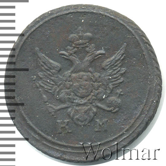 Деньга 1804 года КМДата выпуска: 01.01.1804 АверсВ центре изображен Государственный Герб Российской империи — двуглавый орёл с поднятыми вверх распущенными крыльями. Головы которого увенчаны двумя коронами, третья, большая корона над ними. На груди орла расположен Московский герб — щит с изображением Георгия Победоносца, поражающего копьем дракона. Вокруг щита орденская цепь с орденом Св. Апостола Андрея Первозванного. В правой лапе орла — скипетр, в левой — держава. Под правой лапой — буква «К», под левой — буква «М». Обозначение Сузунского монетного двора. Вокруг гербового орла, вдоль канта, проходит двухлинейный ободок.РеверсВ центре надпись — слово «ДЕНЬГА». Над надписью — цифра «1.». Под надписью — фигурная черта, под ней — дата выпуска монеты «1804.». Вдоль канта проходит двухлинейный ободок.Каталожные номера