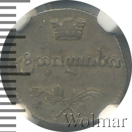 Полуабаз 1805 года ПЗДата выпуска: 01.01.1805 АверсВ центре надпись «თბილისი" (Тбилиси). Над надписью — каменная зубчатая корона (эмблема Тбилиси). Под надписью — перекрещённые пальмовая и оливковая ветви.РеверсВ центре надпись — надпись в две строки: «ქართლი თეთრი" (грузинское серебро). Над надписью грузинская цифра, обозначающая номинал — 100 динаров (10 копеек). Ниже надписи указан год чеканки. Под ним фигурная черта. Под чертой буквы «П.З». Инициалы минцмейстера Петра Зайцева.Каталожные номера