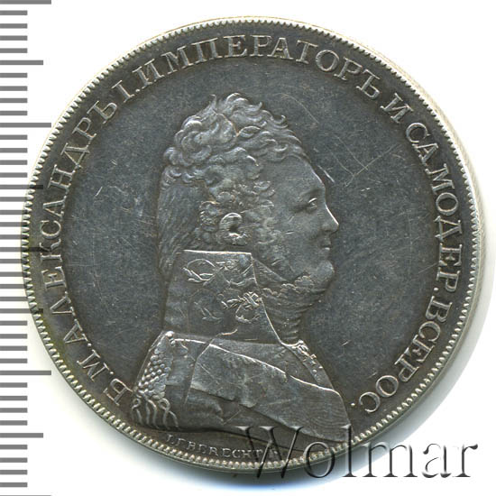 1 рубль 1806 годаДата выпуска: 01.01.1806 АверсВ центре профильный бюст вправо императора Александра I в мундире Лейб-гвардии Преображенского полка. Под портретом подпись медальера «LEBERECHT F.» — Carl (Карл Александрович Леберехт) Leberecht F.(Fecit — резал). Вокруг портрета надпись: «Б. М. АЛЕКСАНДРЪ I. ИМПЕРАТОРЪ И САМОДЕР. ВСЕРОС.». По окружности канта имеются рельефные элементы, выполненные в виде зубцов.РеверсВ центральной части изображен Государственный Герб Российской империи — двуглавый орёл, головы которого увенчаны двумя коронами, третья, большая корона над ними. На груди орла расположен Московский герб — щит с изображением Георгия Победоносца, поражающего копьем дракона. Вокруг щита орденская цепь с орденом Св. Апостола Андрея Первозванного. В правой лапе орла — скипетр, в левой — держава. Вокруг орла, вдоль канта, круговая, обращённая наружу, надпись: «МОНЕТА РУБЛЬ 1806•". По окружности канта имеются рельефные элементы, выполненные в виде зубцов.Каталожные номера