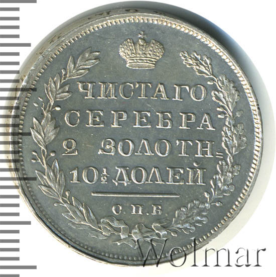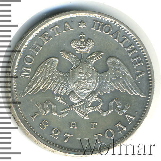 Полтина 1827 года СПБ-НГДата выпуска: 01.01.1827 АверсВ центре изображен Государственный Герб Российской империи — двуглавый орёл с распростёртыми и опущенными вниз крыльями. На груди орла расположен Московский герб — щит с изображением Георгия Победоносца, поражающего копьем дракона. Гербовый щит, над головами орла, венчает императорская корона. Орёл держит, перевитые орденской лентой ордена Св. Апостола Андрея Первозванного, громовые стрелы и факел в правой лапе и лавровый венок — в левой. Под лентой буквы: слева «Н», справа «Г». Инициалы минцмейстера Николая Грачева. Над орлом обозначение номинала — круговая надпись «МОНЕТА ПОЛТИНА.» разделённая шестиконечной звездой. Под орлом — дата выпуска монеты «1827 ГОДА.». По окружности канта имеются рельефные элементы, выполненные в виде зубцов.РеверсВ центре надпись в четыре строки: «ЧИСТАГО"│"СЕРЕБРА"│"2 ЗОЛОТН="│"10 ½ ДОЛЕЙ». Над надписью — императорская корона. Под надписью — прямая черта, под ней — обозначение Санкт-Петербургского монетного двора «С.П.Б.». Вдоль канта, не доходя до короны, изображен венок из лавровой и дубовой ветви, которые в нижней части переплетены лентой. По окружности канта имеются рельефные элементы, выполненные в виде зубцов.Каталожные номера