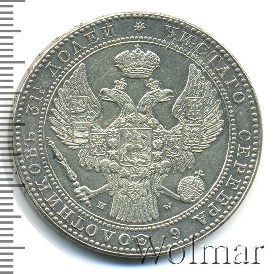 1 ½ рубля — 10 злотых 1838 года MW «Русско-польские» (русско-польские)Дата выпуска: 01.01.1838 АверсВ центре изображен Государственный Герб Российской империи — двуглавый орёл, головы которого увенчаны двумя коронами, третья, большая корона над ними. На груди орла расположен Московский герб — щит с изображением Георгия Победоносца, поражающего копьем дракона. Вокруг щита орденская цепь с орденом Св. Апостола Андрея Первозванного. На крыльях изображены титульные гербы: на правом — Казанский, Астраханский и Сибирский, на левом — Польский, Таврический и Финляндский. В правой лапе орла — скипетр, в левой — держава. Под правой лапой — буква «M», под левой — буква «W». Обозначение Варшавского монетного двора. Центральная часть отделена от остального изображения, окружностью в виде точек. За окружностью круговая надпись: «ЧИСТАГО СЕРЕБРА 6 ЗОЛОТНИКОВЪ 31 ½ ДОЛЕЙ», разделенная сверху цветочной розеткой. По окружности канта имеются рельефные элементы, выполненные в виде точек.РеверсВ центре надпись в четыре строки: «1 ½"│"РУБЛЯ."│"10"│"ZLOT•". Под надписью дата выпуска монеты — «1838.». Вдоль канта изображен венок из лавровой и дубовой ветви, которые в нижней части перевязаны лентой на узел бантом. По окружности канта имеются рельефные элементы, выполненные в виде точек.Каталожные номера