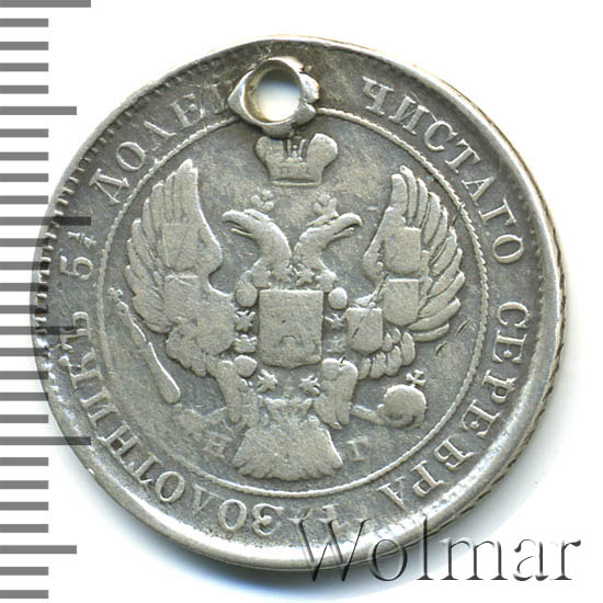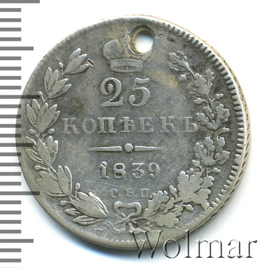 Динамика цен по монете 25 копеек 1839 СБП НГ (Орел 2 типа. Перепутка) F25 копеек 1839 года СБП-НГ. ПерепуткаДата выпуска: 01.01.1839 АверсВ центре изображен Государственный Герб Российской империи — двуглавый орёл, головы которого увенчаны двумя коронами, третья, большая корона над ними. На груди орла расположен Московский герб — щит с изображением Георгия Победоносца, поражающего копьем дракона. Вокруг щита орденская цепь с орденом Св. Апостола Андрея Первозванного. На крыльях изображены титульные гербы: на правом — Казанский, Астраханский и Сибирский, на левом — Польский, Таврический и Финляндский. В правой лапе орла — скипетр, в левой — держава. Под правой лапой — буква «Н», под левой — буква «Г». Инициалы минцмейстера Николая Грачева. Центральная часть отделена от остального изображения, окружностью в виде точек. За окружностью круговая надпись: «ЧИСТОГО СЕРЕБРА 1 ЗОЛОТНИК 5 ¼ ДОЛЕЙ», разделенная сверху цветочной розеткой. По окружности канта имеются рельефные элементы, выполненные в виде зубцов.РеверсВ центре указан номинал «25». Над цифрой — Корона Российской империи. Под цифрой номинала — слово «КОПЕЕК». Ниже, расположен декоративный разделитель в виде двух разнонаправленных фигурных линий и небольшой окружности между ними, в центре которой, выпуклая точка. Под разделителем — дата выпуска монеты «1839». Под цифрой даты — обозначение монетного двора «С.П.Б.». Вдоль канта, не доходя до короны, изображен венок из лавровой и дубовой ветви, которые в нижней части перевязаны лентой на узел бантом. По окружности канта имеются рельефные элементы, выполненные в виде зубцов.Каталожные номера