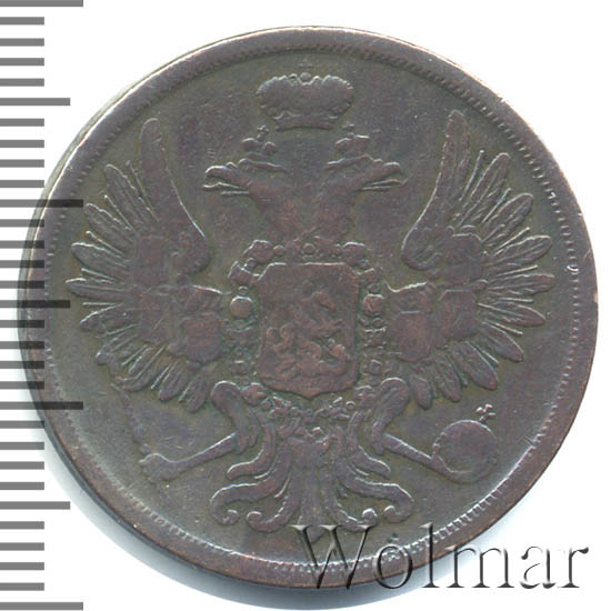 2 копейки 1853 года ВМДата выпуска: 01.01.1853 АверсВ центре изображен Государственный Герб Российской империи — двуглавый орёл, головы которого увенчаны двумя коронами, третья, большая корона над ними. На груди орла расположен Московский герб — щит с изображением Георгия Победоносца, поражающего копьем дракона. Вокруг щита орденская цепь с орденом Св. Апостола Андрея Первозванного. На крыльях изображены титульные гербы: на правом — Казанский, Астраханский и Сибирский, на левом — Польский, Таврический и Финляндский. В правой лапе орла — скипетр, в левой — держава. По окружности канта имеются рельефные элементы, выполненные в виде зубцов.РеверсВ центре указан номинал «2», ограниченный с обеих сторон цветочными розетками. Под цифрой номинала — слово «КОПЕЙКИ», под ним год выпуска монеты «1853.». Ниже, расположен декоративный разделитель в виде двух фигурных линий и небольшой точки между ними. Под разделителем обозначение монетного двора «В.М.».По окружности, вдоль канта, декоративный венок вверху, внизу, справа и слева крестообразно перехваченный лентами. По окружности канта имеются рельефные элементы, выполненные в виде зубцов.Каталожные номера
