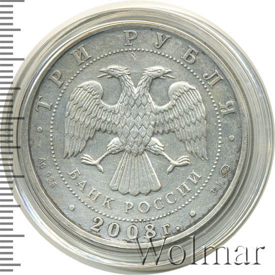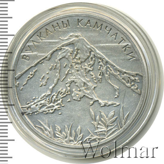 Вулканы КамчаткиСерия: Россия во всемирном, культурном и природном наследии ЮНЕСКО Аверсв центре диска — эмблема Банка России (двуглавый орел с опущенными крыльями, под ним надпись полукругом «БАНК РОССИИ»), обрамленная кругом из точек и надписями по кругу: вверху — «ТРИ РУБЛЯ», внизу — «2008 г.», слева — обозначение металла, проба сплава, справа — содержание драгоценного металла в чистоте и товарный знак монетного двора.Реверсизображение действующего вулкана, на переднем плане — растительность, вверху по окружности — надпись: «ВУЛКАНЫ КАМЧАТКИ».Каталожные номера