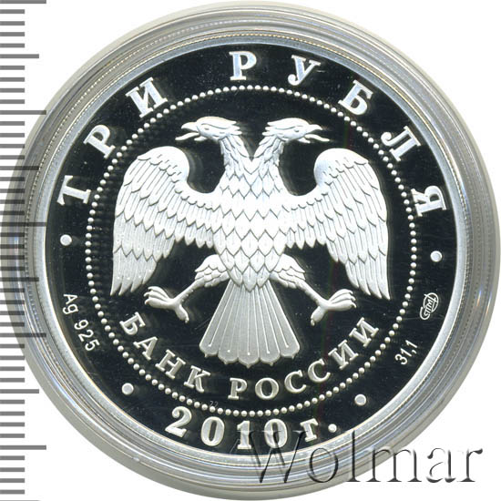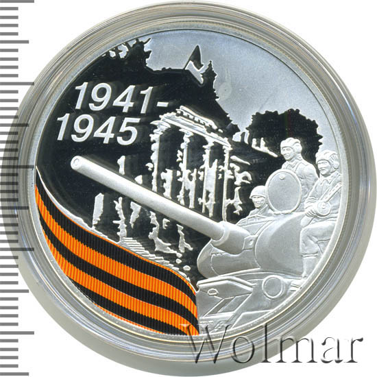Солдаты на танке. 65-я годовщина Победы в Великой Отечественной войне 1941−1945 гг.Дата выпуска: 01.03.2010 Аверсв центре диска — эмблема Банка России (двуглавый орел с опущенными крыльями, под ним — надпись полукругом «БАНК РОССИИ»), обрамленная кругом из точек и надписями по кругу — вверху: «ТРИ РУБЛЯ», внизу: слева — обозначения драгоценного металла и пробы сплава, в центре — дата выпуска «2010 г.», справа — содержание химически чистого металла и товарный знак монетного двора.Реверсна переднем плане справа — три советских солдата на танке, на втором плане — изображение разрушенного Рейхстага, вверху слева в две строки — даты «1941−1945», внизу — цветное изображение орденской ленты.Каталожные номера