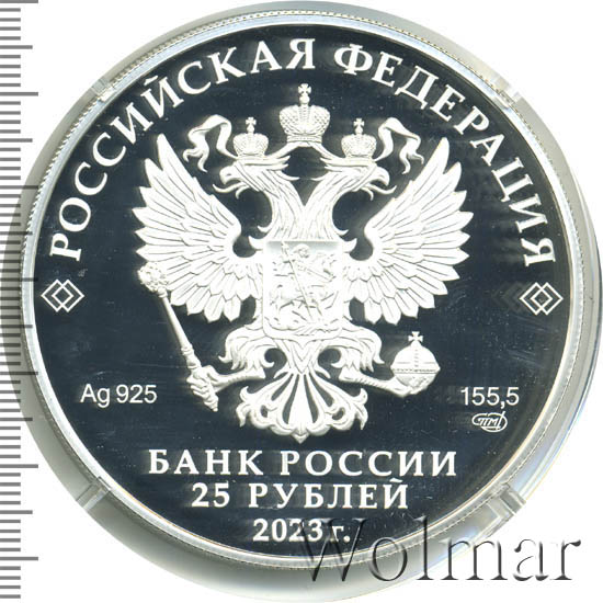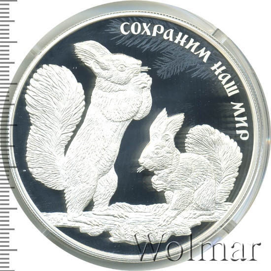 Белка обыкновеннаяСерия: Сохраним наш мир Белка обыкновенная, или векша (лат. Sciurus vulgaris) — грызун семейства беличьих. В мире насчитывается до 30 видов семейства беличьих, распространенных по всей территории земного шара, и только белка обыкновенная живет на наших просторах. Это шустрый зверек со стройным пропорциональным телом. Хвост — длинный и пушистый — может достигать 19 сантиметров и составлять 2/3 от всей длины тела. Этот грызун вырастает в длину до 30 сантиметров, набирая вес не больше 400 граммов. У белки круглая голова с темного цвета глазами, похожими на бусинки, а также длинные уши, увенчанные торчащими вверх кисточками. Белки живут на деревьях. Они ищут стволы с дуплами, где и обустраивают для себя жилище — набивают дупло лишайником, сухой травой и листьями. Гнездо может находиться на высоте до 15 метров, среди густых веток. Диаметр гнезда достигает 30 сантиметров и имеет форму шара. Перед наступлением зимы белки обзаводятся густым мехом. Летом же мех у зверька короткий, редкий и жесткий. Белки, как и многие другие животные, имеющие мех, линяют 2 раза в год, при этом хвост меняет свой шерстяной покров только 1 раз в год. Линька весной начинается с головы, а осенняя линька — с хвоста. Белка обыкновенная не метит свои владения, поэтому на одной территории может проживать несколько особей. Большую часть времени зверек проводит на деревьях, при этом наибольшую активность проявляет в утренние и вечерние часы. В это время суток белка занята поисками пропитания. В случае опасности животное прячется в кроне деревьев. Белка с легкостью перепрыгивает с ветки на ветку, преодолевая по прямой до 4-х метров и по нисходящей дуге до 15 метров. Хвост у нее служит в качестве руля. В зимнее время больше перемещается по деревьям, а в брачный период, а также когда нет снега — может перемещаться и по земле, длинными прыжками. Когда лютуют морозы или сильные снегопады с метелями, белка обычно находится в своем укрытии, и покидает его только в случае сильного голода. В августе-сентябре происходит масштабное расселение молодняка, при этом особи покидают родные гнезда и удаляются от них на расстояние до 70−300 километров. В дикой природе всего 10 процентов особей доживает до возраста 4 лет. При содержании в неволе эти грызуны способны прожить не меньше 10 лет. Источник: ar.culture.ru Аверсрельефное изображение Государственного герба Российской Федерации, над ним вдоль канта — надпись полукругом «РОССИЙСКАЯ ФЕДЕРАЦИЯ», обрамленная с обеих сторон сдвоенными ромбами, под гербом: слева — обозначения драгоценного металла и пробы сплава, справа — содержание химически чистого металла и товарный знак монетного двора, внизу в центре в три строки — надпись «БАНК РОССИИ», номинал монеты «25 РУБЛЕЙ», год выпуска «2023 г.».Реверсвыполненное в рельефе и в технике лазерного матирования изображение двух белок под сосновой веткой; справа вверху по окружности — рельефная надпись «СОХРАНИМ НАШ МИР».Каталожные номера