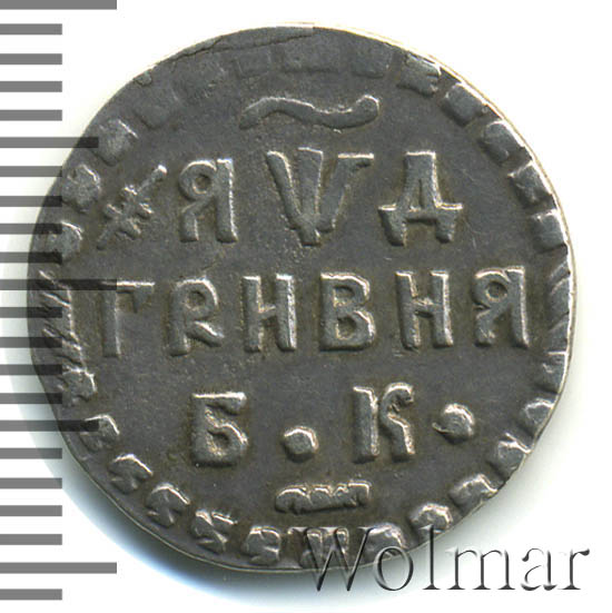 Динамика цен по монете Гривна 1704 БК («Б•К•») XFГривна 1704 года БК. «Б•К•"Дата выпуска: 01.01.1704 АверсВ центре изображен Государственный Герб России — двуглавый орёл с распущенными крыльями. Головы которого увенчаны двумя коронами, третья, большая корона над ними. В правой лапе орла — скипетр, в левой — держава. Вокруг гербового орла точечный ободок. За ободком — буквы «Ц • И • К • П • Я • В • Р • С •". По окружности канта — орнамент из точек.РеверсВ центре надпись в три строки: «҂ЯѰД•"│"ГРИВНЯ"│"Б•К•", в которой указан: год выпуска кириллицей (1704), номинал и знак монетного двора. По окружности канта — орнамент из точек.Каталожные номера