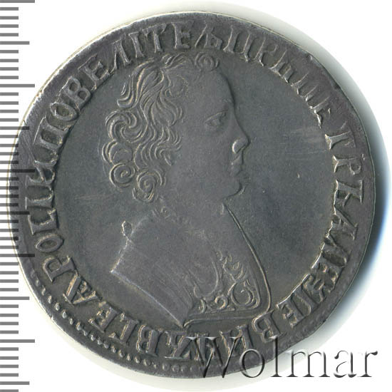 147 проходов1 рубль 1705 МД («Е» в дате перевернута) „Портрет Петра I. Большая голова“. |