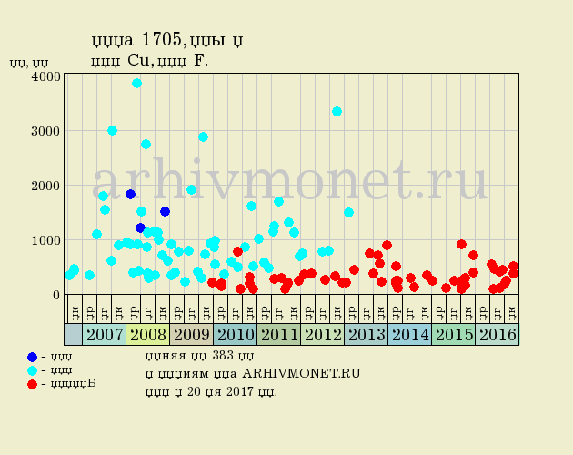 Средняя цена: 383 рублей (по 124 лотам). Торги по представленной на фото монете состоялись на аукционе Аукцион.СПБ 22 февраля 2017 года. Достигнутая цена на торгах: 394 рублей. |