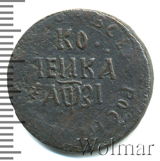 1 копейка 1717 года БКДата выпуска: 01.01.1717 АверсВ центре изображение Георгия Победоносца, поражающего копьём дракона. Под всадником — буквы «БК». Обозначение Набережного монетного двора. Изображение заключено в точечный ободок. Над изображением, стилизованный из точек и линий, крест. Вокруг центрального изображения круговая надпись: «ЦРЬ ПЕТРЪ АЛЕЗIЕВИЧЪ». По окружности канта имеются рельефные элементы, выполненные в виде точек.РеверсВ центре указан номинал в две строки: «КО"│"ПЕИКА». Под надписью, кириллицей, указан год выпуска — «1717». Изображение заключено в линейный ободок. Над изображением, стилизованный из точек и линий, крест. Вокруг центрального изображения круговая надпись: «ВСЕѦ РОСIИ ПОВЕЛИТЕЛЬ». По окружности канта имеются рельефные элементы, выполненные в виде точек.Каталожные номера