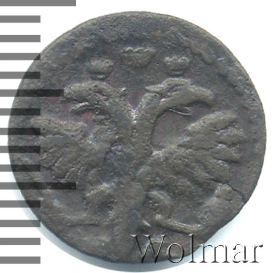 Динамика цен по монете Полушка 1720 НД (Год славянский) „Полушка ВРП: «Всея России Повелитель»“ XFПолушка 1720 года НД. Дата славянскаяДата выпуска: 01.01.1720 АверсВ центре изображен Государственный Герб России — двуглавый орёл с распущенными крыльями. Головы которого увенчаны двумя коронами, третья, большая корона над ними. В правой лапе орла — скипетр, в левой — держава. Под правой лапой — буква «Н», под левой — буква «Д». Обозначение Набережного монетного двора. По окружности канта — витой точечный ободок.РеверсВ центре указан номинал в две строки: «ПОЛУ"│"ШКА». Под номиналом, кириллицей, указан год выпуска — «1720». Над номиналом надпись: «ВРП». По окружности канта — витой точечный ободок.Каталожные номера