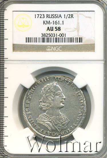 Динамика цен по монете Полтина 1723 - „Портрет Петра I. В античных доспехах («Матрос»). Бюст внутри надписи“ AUПолтина 1723 года. Московский типДата выпуска: 01.01.1723 АверсВ центре профильный портрет вправо императора Петра I, увенчанный лавровым венком. Вокруг портрета круговая надпись: «ПЕТРЪ, А ИМПЕРАТОРЪ IСАМОДЕРЖЕЦЪ ВСЕРОСИIСКИI». По окружности канта — витой ободок.РеверсВ центре изображен Государственный Герб Российской империи — двуглавый орёл с распущенными крыльями. Головы которого увенчаны двумя коронами, третья, большая корона над ними. В правой лапе орла — скипетр, в левой — держава. Вокруг орла надпись: «МОНЕТА НОВАѦ ЦЕНА ПОЛТIНА 1723». По окружности канта — витой ободок.Каталожные номера