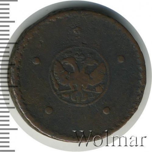 5 копеек 1725 года МД. Большая корона без креста. Год над номиналомДата выпуска: 01.01.1725 АверсВ центре изображен упрощённый Государственный Герб Российской империи — двуглавый орёл с поднятыми вверх распущенными крыльями. Головы которого увенчаны двумя коронами, третья, большая корона над ними. В правой лапе орла — скипетр, в левой — держава. Под правой лапой — буква «М», под левой — буква «Д». Герб окружен окружностью в виде точек. Вокруг центрального изображения — 5 выпуклых счётных точек. Точки обозначают (дублируют) номинал монеты.РеверсКрестообразно расположенные надписи: номинал — «ПѦТЬ КОПѢЕКЬ» и год выпуска — «1725 ГОДА». Надписи окантованы двойными линиями.Каталожные номера
