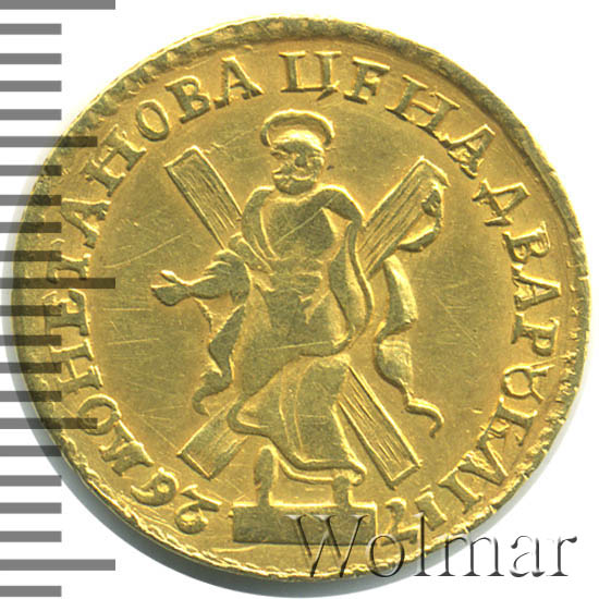 Динамика цен по монете 2 рубля 1726 - „Портрет Екатерины I“ XF2 рубля 1726 годаДата выпуска: 01.01.1726 АверсВ центре профильный портрет влево императрицы Екатерины I Алексеевны. Вокруг портрета круговая надпись: «•ЕКАТЕРИНА• IМПЕРАТЪ• IСАМОДЕРЪ• ВСЕРОСIСКАЯ».РеверсВ центре изображён Святой апостол Андрей Первозванный несущий крест. Под ним — полоса земли. Вокруг изображения, обращенная внутрь, надпись: «МОНЕТА НОВА ЦЕНА ДВА РУБЛI 1726». Полоса земли делит год выпуска (17−26).Каталожные номера