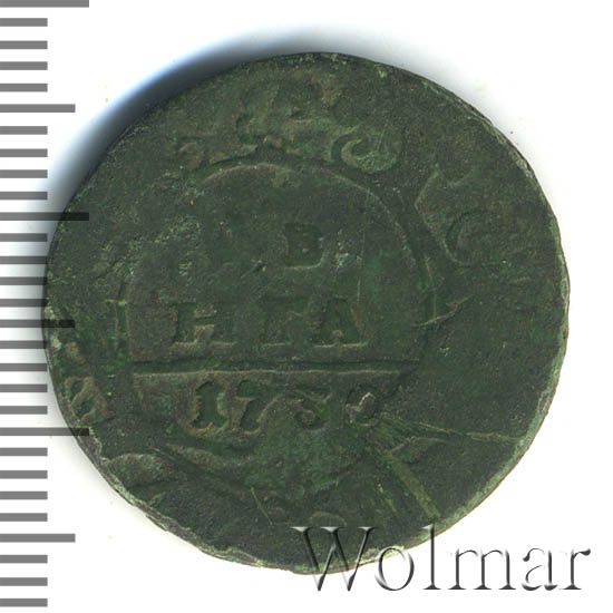 Динамика цен по монете Деньга 1730 - (Над годом 1 черта) VFДенга 1730 года. Над годом 1 чертаДата выпуска: 01.01.1730 АверсВ центре изображен упрощённый Государственный Герб Российской империи — двуглавый орёл с поднятыми вверх распущенными крыльями. Головы которого увенчаны двумя коронами, третья, большая корона над ними. В правой лапе орла — скипетр, в левой — держава.РеверсВ центре изображён картуш украшенный виньетками, по обеим сторонам две лавровые ветви, сверху — цветочная розетка. Под картушем — две перекрещенные пальмовые ветви с обвязкой (бантом). В картуше надпись в три строки, в которой указан номинал и год выпуска: «ДЕ"│"НГА"│"1730». Между номиналом и годом выпуска одна прямая черта.Каталожные номера