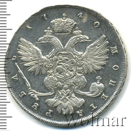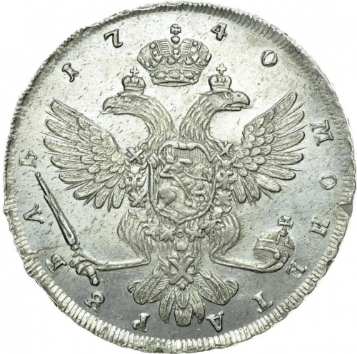 Динамика цен по монете 1 рубль 1740 СПБ («Петербургский тип». Розетки на груди и плече.) „Портрет Анны“ MS1 рубль 1740 года СПБДата выпуска: 01.01.1740 АверсВ центре профильный портрет вправо императрицы Анны Иоанновны. Под портретом буквы «С П Б», обозначение Санкт-Петербургского монетного двора. Вокруг портрета круговая надпись: «Б•М•АННА IМПЕРАТРИЦА IСАМОДЕРЖИЦА ВСЕРОСИСКАЯ:».РеверсВ центре изображен Государственный Герб Российской империи — двуглавый орёл с поднятыми вверх распущенными крыльями, головы которого увенчаны двумя коронами, третья, большая корона над ними. На груди орла расположен Московский герб — щит с изображением Георгия Победоносца, поражающего копьём дракона. Вокруг щита орденская цепь с орденом Св. апостола Андрея Первозванного. В правой лапе орла — скипетр, в левой — держава. Над орлом дата выпуска — «1740», разделённая большой короной. Вокруг орла, обращённая внутрь, надпись: «МОНЕТА РУБЛЬ».Каталожные номера