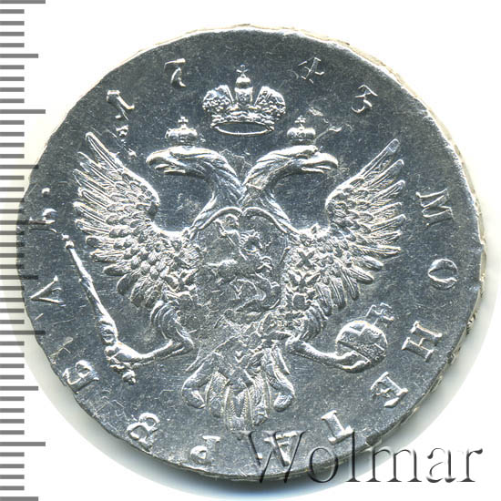 Динамика цен по монете 1 рубль 1743 ММД («Московский тип». Корсаж прямой) „Портрет Елизаветы“ AU1 рубль 1743 года ММД. Край корсажа прямойДата выпуска: 01.01.1743 АверсВ центре профильный портрет вправо императрицы Елизаветы I (Петровны). Вокруг портрета круговая надпись: «Б•М•ЕЛИСАВЕТЪ•I•IМП: IСАМОД: ВСЕРОС:». Под портретом буквы «М•М•Д» — обозначение московского Красного монетного двора.РеверсВ центре изображен Государственный Герб Российской империи — двуглавый орёл, головы которого увенчаны двумя коронами, третья, большая корона над ними. На груди орла расположен Московский герб — щит с изображением Георгия Победоносца, поражающего копьём дракона. Вокруг щита орденская цепь с орденом Св. апостола Андрея Первозванного. В правой лапе орла скипетр, в левой — держава. Над орлом дата выпуска монеты — «1743». Вокруг орла, обращенная внутрь, надпись: «МОНЕТА•РУБЛЬ•".Каталожные номера