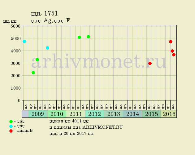 Средняя цена: 4011 рублей (по 10 лотам). Торги по представленной на фото монете состоялись на аукционе Аукцион.СПБ 09 ноября 2016 года. Достигнутая цена на торгах: 3685 рублей. |