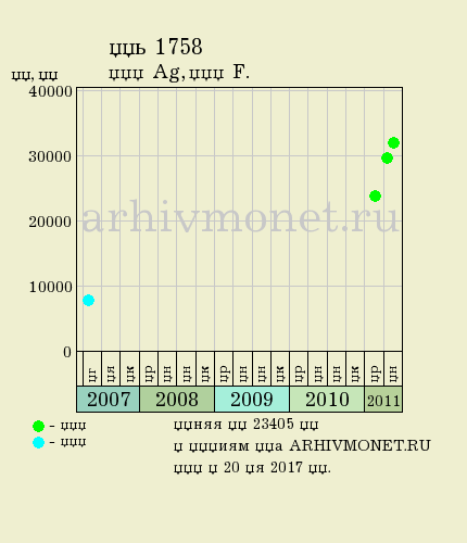 Средняя цена: 23405 рублей (по 4 лотам). Торги по представленной на фото монете состоялись на аукционе Волмар 21 июля 2011 года. Достигнутая цена на торгах: 32012 рублей. |