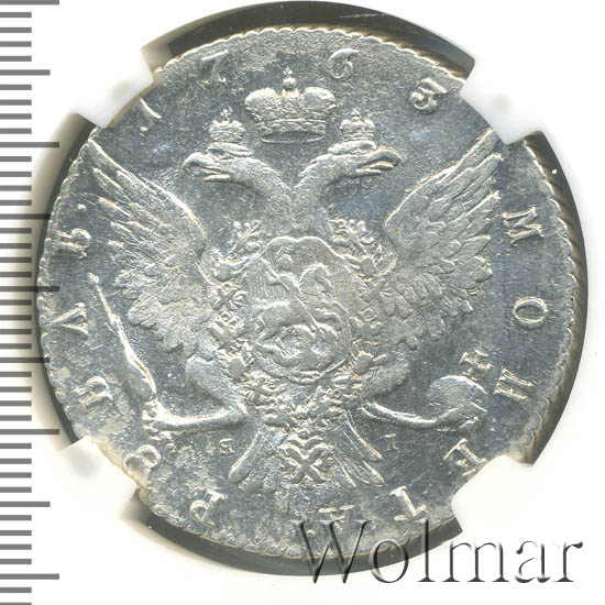 Динамика цен по монете 1 рубль 1763 СПБ ТI ЯI (С шарфом на шее) „Портрет Екатерины II“ AU1 рубль 1763 года СПБ-TI-ЯIДата выпуска: 01.01.1763 АверсВ центре профильный портрет вправо императрицы Екатерины II. Вокруг портрета круговая надпись: «Б•М•ЕКАТЕРИНА•II•IМП•IСАМОД•ВСЕРОС». В обрезе рукава — буквы «Т.I.», инициалы медальера Тимофея Иванова. Под портретом буквы «С П Б», обозначение Санкт-Петербургского монетного двора.РеверсВ центре изображен Государственный Герб Российской империи — двуглавый орёл, головы которого увенчаны двумя коронами, третья, большая корона над ними. На груди орла расположен Московский герб — щит с изображением Георгия Победоносца, поражающего копьем дракона. Вокруг щита орденская цепь с орденом Св. Апостола Андрея Первозванного. В правой лапе орла — скипетр, в левой — держава. Под правой лапой — буква «Я», под левой — буква «I». Инициалы минцмейстера Якова Иванова. Над орлом дата выпуска монеты — «1763». Вокруг орла, обращенная внутрь, надпись: «МОНЕТА•РУБЛЬ•".Каталожные номера