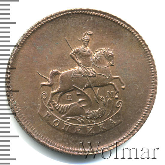 Динамика цен по монете 1 копейка 1765 ЕМ „Новодел“ MS1 копейка 1765 года ЕМДата выпуска: 01.01.1765 АверсВ центре — рельефное изображение Георгия Победоносца верхом на коне, поражающего копьём дракона. Под конём — буквы «Е» и «М». Внизу, под центральным изображением, полукругом располагается бандероль с обозначением номинала — «КОПЕИКА». По окружности канта имеются рельефные элементы, выполненные в виде точек.РеверсВ центре изображён вензель Екатерины II. Над вензелем — императорская корона. По обеим сторонам от вензеля цифры даты выпуска монеты: слева «17», справа — «65» (1765 год). Вокруг центрального изображения, вдоль канта, изображён венок из лавровой и пальмовой ветвей, которые, в нижней части, перевязаны лентой на узел бантом. По окружности канта имеются рельефные элементы, выполненные в виде точек.Каталожные номера