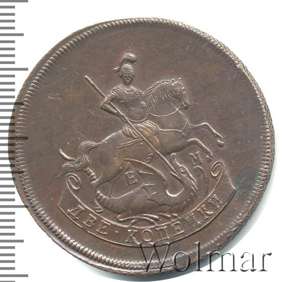 Динамика цен по монете 2 копейки 1765 ЕМ „Новодел“ MS2 копейки 1765 года ЕМДата выпуска: 01.01.1765 АверсВ центре — рельефное изображение Георгия Победоносца верхом на коне, поражающего копьём дракона. Под конём — буквы «Е» и «М». Внизу, под центральным изображением, полукругом располагается бандероль с обозначением номинала — «ДВЕ•КОПЕИКИ». По окружности канта имеются рельефные элементы, выполненные в виде точек.РеверсВ центре изображён вензель Екатерины II. Над вензелем — императорская корона. По обеим сторонам от вензеля цифры даты выпуска монеты: слева — «17», справа — «65» (1765 год). Вокруг центрального изображения, вдоль канта, изображён венок из лавровой и пальмовой ветвей, которые, в нижней части, перевязаны лентой на узел бантом. По окружности канта имеются рельефные элементы, выполненные в виде точек.Каталожные номера
