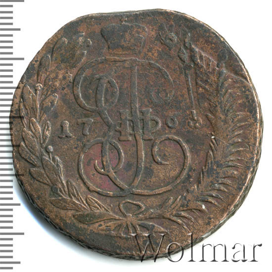 7 проходов5 копеек 1765 ММ (Москва) „Вензель императрицы Екатерины II Великой“. |