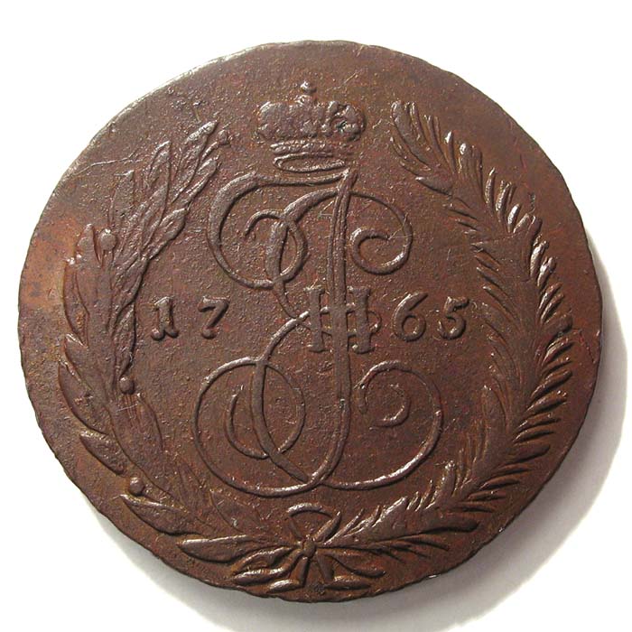 Динамика цен по монете 5 копеек 1765 СПМ (Санкт-Петербург) „Вензель императрицы Екатерины II Великой“ AU5 копеек 1765 года СПМДата выпуска: 01.01.1765 АверсВ центре изображен Государственный Герб Российской империи — двуглавый орёл с поднятыми вверх распущенными крыльями. Головы которого увенчаны двумя коронами, третья, большая корона над ними. На груди орла расположен Московский герб — щит с изображением Георгия Победоносца, поражающего копьём дракона. Вокруг щита орденская цепь с орденом Св. Апостола Андрея Первозванного. В правой лапе орла — скипетр, в левой — держава. Под правой лапой — буква «С•П», под левой — буква «М». Обозначение Санкт-Петербургского монетного двора. Внизу, под центральным изображением, полукругом располагается бандероль с обозначением номинала — «ПЯТЬ•КОПѢЕКЪ».РеверсВ центре изображён вензель Екатерины II. Над вензелем — императорская корона. По обеим сторонам от вензеля цифры даты выпуска монеты: слева — «17», справа — «65» (1765 год). Вокруг центрального изображения, вдоль канта, изображён венок из лавровой и пальмовой ветвей, которые, в нижней части, перевязаны лентой на узел бантом.Каталожные номера