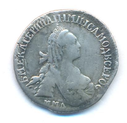 Динамика цен по монете 15 копеек 1767 ММД (Без шарфа на шее) „Портрет Екатерины II“ F15 копеек 1767 года ММДДата выпуска: 01.01.1767 АверсВ центре профильный портрет вправо императрицы Екатерины II. Вокруг портрета круговая надпись: «Б•М•ЕКАТЕРИНА•II•IМП•IСАМОД•ВСЕРОС». Под портретом буквы «М М Д», обозначение Московского монетного двора.РеверсВ центре изображен Государственный Герб Российской империи — двуглавый орёл, головы которого увенчаны двумя коронами, третья, большая корона над ними. В правой лапе орла — скипетр, в левой — держава. На груди орла щит с обозначением номинала — цифрой «15». Вокруг орла, вдоль канта, 15 счётных точек, разделённые на 3 группы по пять точек. Также обозначающие номинал монеты. Ниже орла, на стилизованной ленте, дата выпуска — «1767».Каталожные номера