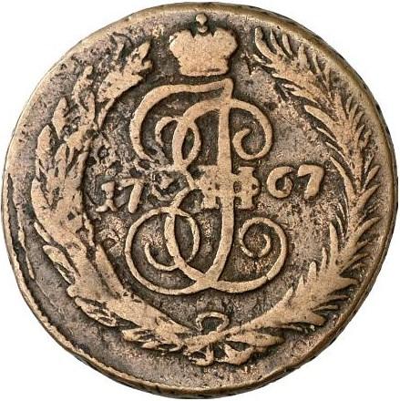 1 копейка 1767 года СПМДата выпуска: 01.01.1767 АверсВ центре — рельефное изображение Георгия Победоносца верхом на коне, поражающего копьём дракона. По сторонам коня — буквы «С•П» и «М». Внизу, под центральным изображением, полукругом располагается бандероль с обозначением номинала — «КОПЕИКА».РеверсВ центре изображён вензель Екатерины II. Над вензелем — императорская корона. По обеим сторонам от вензеля цифры даты выпуска монеты: слева «17», справа — «67» (1767 год). Вокруг центрального изображения, вдоль канта, изображён венок из лавровой и пальмовой ветвей, которые, в нижней части, перевязаны лентой на узел бантом.Каталожные номера