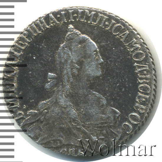 Динамика цен по монете 20 копеек 1768 СПБ ТI (Без шарфа на шее) „Портрет Екатерины II“ AU20 копеек 1768 года СПБ-TIДата выпуска: 01.01.1768 АверсВ центре профильный портрет вправо императрицы Екатерины II. Вокруг портрета круговая надпись: «Б•М•ЕКАТЕРИНА•II•IМП•IСАМОД•ВСЕРОС». В обрезе рукава — буквы «T.I.», инициалы медальера Тимофея Иванова. Под портретом буквы «С П Б», обозначение Санкт-Петербургского монетного двора.РеверсВ центре изображен Государственный Герб Российской империи — двуглавый орёл, головы которого увенчаны двумя коронами, третья, большая корона над ними. В правой лапе орла — скипетр, в левой — держава. На груди орла щит с обозначением номинала — цифрой «20». Вокруг орла, вдоль канта, 20 счётных точек, разделённые на 4 группы по пять точек. Также обозначающие номинал монеты. Ниже орла, на стилизованной ленте, дата выпуска — «1768».Каталожные номера