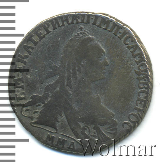 Динамика цен по монете 15 копеек 1769 ММД (Без шарфа на шее) „Портрет Екатерины II“ VF15 копеек 1769 года ММДДата выпуска: 01.01.1769 АверсВ центре профильный портрет вправо императрицы Екатерины II. Вокруг портрета круговая надпись: «Б•М•ЕКАТЕРИНА•II•IМП•IСАМОД•ВСЕРОС». Под портретом буквы «М М Д», обозначение Московского монетного двора.РеверсВ центре изображен Государственный Герб Российской империи — двуглавый орёл, головы которого увенчаны двумя коронами, третья, большая корона над ними. В правой лапе орла — скипетр, в левой — держава. На груди орла щит с обозначением номинала — цифрой «15». Вокруг орла, вдоль канта, 15 счётных точек, разделённые на 3 группы по пять точек. Также обозначающие номинал монеты. Ниже орла, на стилизованной ленте, дата выпуска — «1769».Каталожные номера