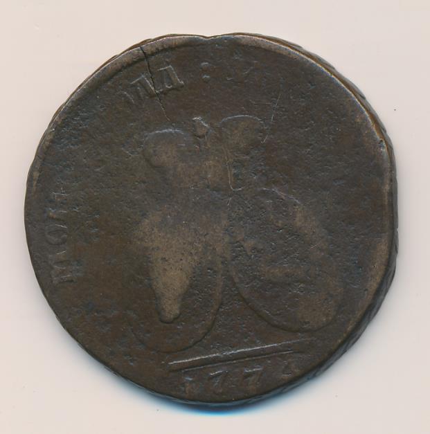 Динамика цен по монете 2 пара/3 копейки 1774 - „Для Молдавии и Валахии“ F2 пара — 3 копейки 1774 годаДата выпуска: 01.01.1774 АверсВ центре изображены два наклонённых друг к другу овальных щита с гербами Молдавии (голова быка с рогами) и Валахии (стоящая на земле птица с крестом в клюве), увенчанные княжеской короной. Сверху круговая надпись: «МОН. МОЛД: И ВАЛОСК.». Под гербами — две черты, одна под другой. Под ними дата выпуска монеты — «1774». По окружности канта имеются рельефные элементы, выполненные в виде зубцов.РеверсВ центре квадратная витая рамка. В рамке надпись в четыре строки: «2"│"ПАРА"│"3"│"КОПѢЕКѢ". Под словом «ПАРА» — две черты. По окружности канта имеются рельефные элементы, выполненные в виде зубцов.Каталожные номера