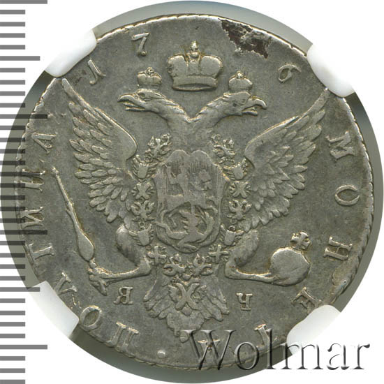 Динамика цен по монете Полтина 1776 СПБ ТI ЯЧ (Без шарфа на шее) „Портрет Екатерины II“ XFПолтина 1776 года СПБ-TI-ЯЧДата выпуска: 01.01.1776 АверсВ центре профильный портрет вправо императрицы Екатерины II. Вокруг портрета круговая надпись: «Б•М•ЕКАТЕРИНА•II•IМП•IСАМОД•ВСЕРОС». В обрезе рукава — буквы «T.I.», инициалы медальера Тимофея Иванова. Под портретом буквы «С П Б», обозначение Санкт-Петербургского монетного двора.РеверсВ центре изображен Государственный Герб Российской империи — двуглавый орёл, головы которого увенчаны двумя коронами, третья, большая корона над ними. На груди орла расположен Московский герб — щит с изображением Георгия Победоносца, поражающего копьем дракона. Вокруг щита орденская цепь с орденом Св. Апостола Андрея Первозванного. В правой лапе орла — скипетр, в левой — держава. Под правой лапой — буква «Я», под левой — буква «Ч». Инициалы минцмейстера Якова Чернышева. Над орлом дата выпуска монеты — «1776». Вокруг орла, обращенная внутрь, надпись: «МОНЕТА•ПОЛТИНА•".Каталожные номера
