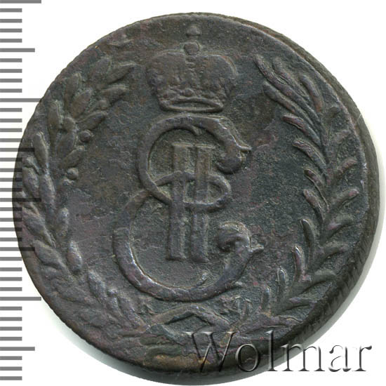 Динамика цен по монете 5 копеек 1778 КМ „Сибирская монета“ XF5 копеек 1778 года КМДата выпуска: 01.01.1778 АверсВ центре — вензель Екатерины II. Над ним императорская корона. Под вензелем обозначение Сузунского монетного двора — буквы «К М». Вокруг центрального изображения, вдоль канта, изображён венок из лавровой и пальмовой ветвей, которые, в нижней части, перевязаны лентой на узел бантом.РеверсВ центре изображен картуш с надписью в три строки: «ПЯТЬ"│"КОПЕ"│"ЕКЪ•", под надписью дата выпуска — «1778». Картуш, с обеих сторон, поддерживается двумя соболями. Над картушем — царская корона, над ней — четырёхлистная цветочная розетка. По окружности, вдоль канта, надпись: «•СИБИРСКАЯ•МОНЕТА•".Каталожные номера