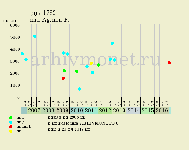 Средняя цена: 2905 рублей (по 17 лотам). Торги по представленной на фото монете состоялись на аукционе Аукцион.СПБ 19 апреля 2017 года. Достигнутая цена на торгах: 2853 рублей. |