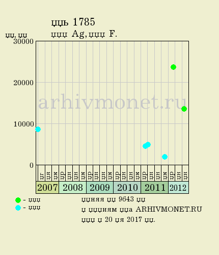 Средняя цена: 9643 рублей (по 6 лотам). Торги по представленной на фото монете состоялись на аукционе Волмар 4 октября 2012 года. Достигнутая цена на торгах: 13659 рублей. |