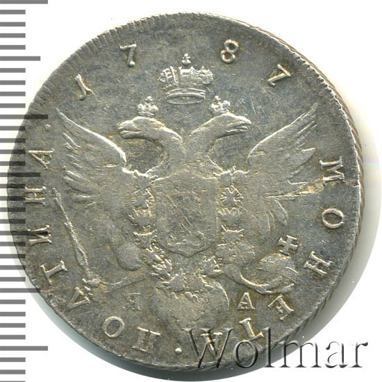 Динамика цен по монете Полтина 1787 СПБ ТI ЯА (Шея короче) „Портрет Екатерины II“ AUПолтина 1787 года СПБ-TI-ЯАДата выпуска: 01.01.1787 АверсВ центре профильный портрет вправо императрицы Екатерины II. Вокруг портрета круговая надпись: «Б•М•ЕКАТЕРИНА•II•IМП•ИСАМОД•ВСЕРОСС•". В обрезе рукава — буквы «T.I.», инициалы медальера Тимофея Иванова. Под портретом буквы «С П Б», обозначение Санкт-Петербургского монетного двора. По окружности канта имеются рельефные элементы, выполненные в виде зубцов.РеверсВ центре изображен Государственный Герб Российской империи — двуглавый орёл, головы которого увенчаны двумя коронами, третья, большая корона над ними. На груди орла расположен Московский герб — щит с изображением Георгия Победоносца, поражающего копьем дракона. Вокруг щита орденская цепь с орденом Св. Апостола Андрея Первозванного. В правой лапе орла — скипетр, в левой — держава. Под правой лапой — буква «Я», под левой — буква «А». Инициалы минцмейстера Якова Афанасьева. Над орлом дата выпуска монеты — «1787». Вокруг орла, обращенная внутрь, надпись: «МОНЕТА•ПОЛТИНА•". По окружности канта имеются рельефные элементы, выполненные в виде зубцов.Каталожные номера