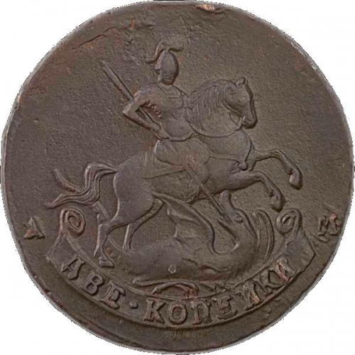 Динамика цен по монете 2 копейки 1789 А М XF2 копейки 1789 года АМДата выпуска: 01.01.1789 АверсВ центре — рельефное изображение Георгия Победоносца верхом на коне, поражающего копьём дракона. По сторонам коня — буквы «А» и «М». Внизу, под центральным изображением, полукругом располагается бандероль с обозначением номинала — «ДВЕ•КОПЕИКИ».РеверсВ центре изображён вензель Екатерины II. Над вензелем — императорская корона. По обеим сторонам от вензеля цифры даты выпуска монеты: слева — «17», справа — «89» (1789 год). Вокруг центрального изображения, вдоль канта, изображён венок из лавровой и пальмовой ветвей, которые, в нижней части, перевязаны лентой на узел бантом.Каталожные номера