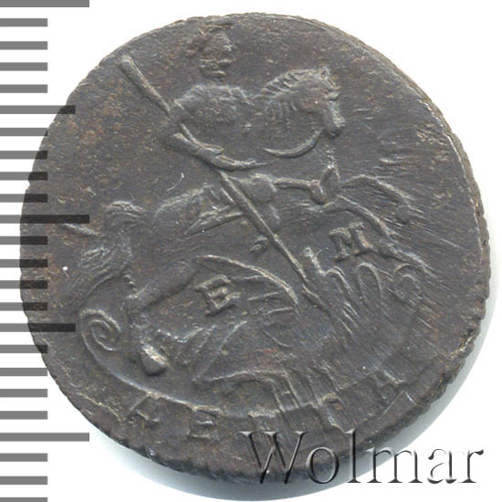 Динамика цен по монете Деньга 1789 ЕМ MSДенга 1789 года ЕМДата выпуска: 01.01.1789 АверсВ центре — рельефное изображение Георгия Победоносца верхом на коне, поражающего копьём дракона. Под конём — буквы «Е» и «М». Внизу, под центральным изображением, полукругом располагается бандероль с обозначением номинала — «ДЕНГА».РеверсВ центре изображён вензель Екатерины II. Над вензелем — императорская корона. По обеим сторонам от вензеля цифры даты выпуска монеты: слева «17», справа — «89» (1789 год). Вокруг центрального изображения, вдоль канта, изображён венок из лавровой и пальмовой ветвей, которые, в нижней части, перевязаны лентой на узел бантом.Каталожные номера