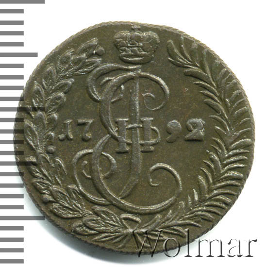 Денга 1792 года КМДата выпуска: 01.01.1792 АверсВ центре — рельефное изображение Георгия Победоносца верхом на коне, поражающего копьём дракона. Под конём — буквы «К» и «М». Внизу, под центральным изображением, полукругом располагается бандероль с обозначением номинала — «ДЕНГА».РеверсВ центре изображён вензель Екатерины II. Над вензелем — императорская корона. По обеим сторонам от вензеля цифры даты выпуска монеты: слева «17», справа — «92» (1792 год). Вокруг центрального изображения, вдоль канта, изображён венок из лавровой и пальмовой ветвей, которые, в нижней части, перевязаны лентой на узел бантом.Каталожные номера