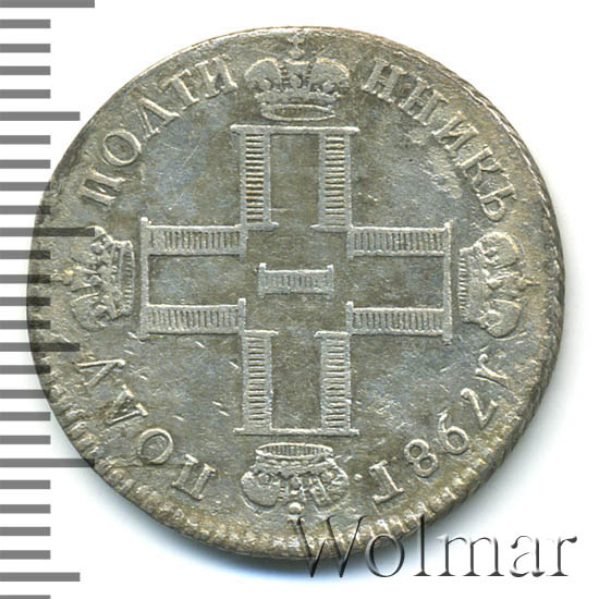 Динамика цен по монете Полуполтинник 1798 СП ОМ (ПОЛУ / ПОЛТИ / ННИК) „Монограмма Павла I“ VFПолуполтинник 1798 года СП-ОМ. ПОЛУ / ПОЛТИ / ННИКДата выпуска: 01.01.1798 АверсВ центре изображена крестообразная монограмма, состоящая из 4 букв «П», увенчанных императорскими коронами и римской цифры «I» в центре. Вдоль канта круговая надпись: «ПОЛУ ПОЛТИ ННИКЪ 1798.Г.», разделённая на 4 части императорскими коронами.РеверсВ центре изображен картуш с надписью в четыре строки: «НЕ НАМЪ"│"НЕ НАМЪ"│"А ИМЯНИ"│"ТВОЕМУ.». Под виньеткой картуша буквы: слева — «С.П», обозначение Банковского монетного двора, справа — «О.М», инициалы минцмейстера Осипа Мейджера.Каталожные номера