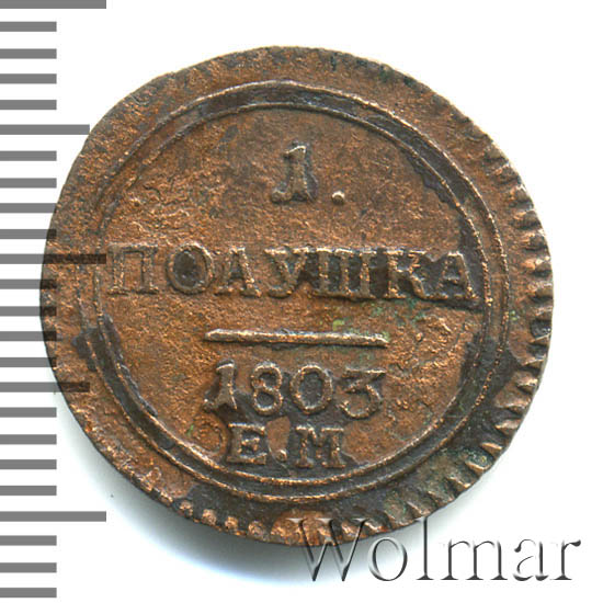 Динамика цен по монете Полушка 1803 ЕМ „Кольцевик“ VFПолушка 1803 года ЕМДата выпуска: 01.01.1803 АверсВ центре изображен Государственный Герб Российской империи — двуглавый орёл с поднятыми вверх распущенными крыльями. Головы которого увенчаны двумя коронами, третья, большая корона над ними. На груди орла расположен Московский герб — щит с изображением Георгия Победоносца, поражающего копьем дракона. Вокруг щита орденская цепь с орденом Св. Апостола Андрея Первозванного. Вокруг гербового орла, вдоль канта, проходит двухлинейный ободок. По окружности канта имеются рельефные элементы, выполненные в виде зубцов.РеверсВ центре надпись — слово «ПОЛУШКА». Над надписью — цифра «1.». Под надписью — выпуклая черта, под ней — дата выпуска монеты «1803.». Под датой обозначение Екатеринбургского монетного двора — буквы «ЕМ». Вдоль канта проходит двухлинейный ободок. По окружности канта имеются рельефные элементы, выполненные в виде зубцов.Каталожные номера