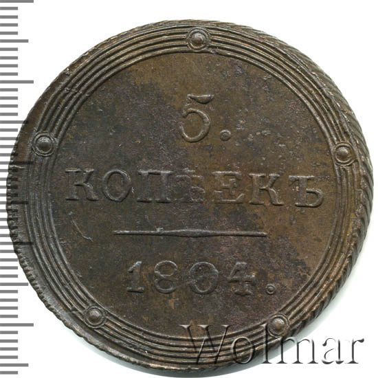 Динамика цен по монете 5 копеек 1804 КМ (Орел 5 типа: орел и хвост шире.) „«Кольцевик»“ AU5 копеек 1804 года КМДата выпуска: 01.01.1804 АверсВ центре изображен Государственный Герб Российской империи — двуглавый орёл с поднятыми вверх распущенными крыльями. Головы которого увенчаны двумя коронами, третья, большая корона над ними. На груди орла расположен Московский герб — щит с изображением Георгия Победоносца, поражающего копьем дракона. Вокруг щита орденская цепь с орденом Св. Апостола Андрея Первозванного. В правой лапе орла — скипетр, в левой — держава. Под правой лапой — буква «К», под левой — буква «М». Обозначение Сузунского монетного двора. Одна над короной, две по сторонам орла, а также слева и справа от обозначения монетного двора, равномерно расположены счётные знаки пяти копеек — пять окантованных точек, размещенных на пятилинейном ободке, проходящем вдоль канта.РеверсВ центре надпись — слово «КОПЕЕКЪ». Над надписью — цифра «5.». Под надписью — фигурная черта, под ней — дата выпуска монеты «1804.». Одна над цифрой, две по сторонам надписи и две под датой, равномерно расположены счётные знаки пяти копеек — пять окантованных точек, размещенных на пятилинейном ободке, проходящем вдоль канта.Каталожные номера
