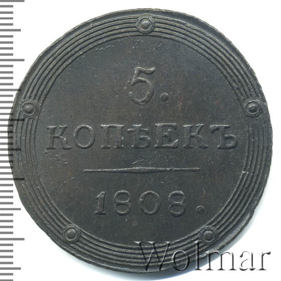 Динамика цен по монете 5 копеек 1808 КМ (Орел 5 типа: орел и хвост шире.) „«Кольцевик»“ AU5 копеек 1808 года КМДата выпуска: 01.01.1808 АверсВ центре изображен Государственный Герб Российской империи — двуглавый орёл с поднятыми вверх распущенными крыльями. Головы которого увенчаны двумя коронами, третья, большая корона над ними. На груди орла расположен Московский герб — щит с изображением Георгия Победоносца, поражающего копьем дракона. Вокруг щита орденская цепь с орденом Св. Апостола Андрея Первозванного. В правой лапе орла — скипетр, в левой — держава. Под правой лапой — буква «К», под левой — буква «М». Обозначение Сузунского монетного двора. Одна над короной, две по сторонам орла, а также слева и справа от обозначения монетного двора, равномерно расположены счётные знаки пяти копеек — пять окантованных точек, размещенных на пятилинейном ободке, проходящем вдоль канта.РеверсВ центре надпись — слово «КОПЕЕКЪ». Над надписью — цифра «5.». Под надписью — фигурная черта, под ней — дата выпуска монеты «1808.». Одна над цифрой, две по сторонам надписи и две под датой, равномерно расположены счётные знаки пяти копеек — пять окантованных точек, размещенных на пятилинейном ободке, проходящем вдоль канта.Каталожные номера