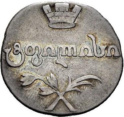 Динамика цен по монете Абаз 1808 АК „Для Грузии в составе Российской Империи“ VFАбаз 1808 года АКДата выпуска: 01.01.1808 АверсВ центре надпись «თბილისი" (Тбилиси). Над надписью — каменная зубчатая корона (эмблема Тбилиси). Под надписью — перекрещённые пальмовая и оливковая ветви.РеверсВ центре надпись — надпись в две строки: «ქართლი თეთრი" (грузинское серебро). Над надписью грузинская цифра, обозначающая номинал — 200 динаров (20 копеек). Ниже надписи указан год чеканки. Под ним прямая черта. Под чертой буквы «А.К». Инициалы минцмейстера Алексея Карпинского.Каталожные номера