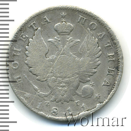 Динамика цен по монете Полтина 1811 СПБ ФГ (Орел 1810 г) VFПолтина 1811 года СПБ-ФГДата выпуска: 01.01.1811 АверсВ центре изображен Государственный Герб Российской империи — двуглавый орёл с поднятыми вверх распущенными крыльями. Головы которого увенчаны двумя коронами, третья, большая корона над ними. На груди орла расположен Московский герб — щит с изображением Георгия Победоносца, поражающего копьем дракона. Вокруг щита орденская цепь с орденом Св. Апостола Андрея Первозванного. В правой лапе орла — скипетр, в левой — держава. Под правой лапой — буква «Ф», под левой — буква «Г». Инициалы минцмейстера Федора Гельмана. Слева от герба круговая надпись — «МОНЕТА», справа — «ПОЛТИНА». Под инициалами — дата выпуска монеты «1811». Все три надписи разделены между собой тремя шестиконечными звёздами. По окружности канта имеются рельефные элементы, выполненные в виде зубцов.РеверсВ центре надпись в четыре строки: «ЧИСТАГО"│"СЕРЕБРА"│"2 ЗОЛОТН="│"10 ½ ДОЛЕЙ». Над надписью — императорская корона. Под надписью — прямая черта, под ней — обозначение Санкт-Петербургского монетного двора «С.П.Б.». Вдоль канта, не доходя до короны, изображен венок из лавровой и дубовой ветви, которые в нижней части переплетены лентой. По окружности канта имеются рельефные элементы, выполненные в виде зубцов.Каталожные номера