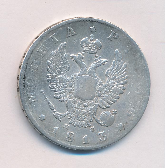 Динамика цен по монете 1 рубль 1813 СПБ ПС (Конец скипетра заканчивается около буквы «М») F1 рубль 1813 года СПБ-ПСДата выпуска: 01.01.1813 АверсВ центре изображен Государственный Герб Российской империи — двуглавый орёл с поднятыми вверх распущенными крыльями. Головы которого увенчаны двумя коронами, третья, большая корона над ними. На груди орла расположен Московский герб — щит с изображением Георгия Победоносца, поражающего копьем дракона. Вокруг щита орденская цепь с орденом Св. Апостола Андрея Первозванного. В правой лапе орла — скипетр, в левой — держава. Под правой лапой — буква «П», под левой — буква «С». Инициалы минцмейстера Павла Ступицына. Слева от герба круговая надпись — «МОНЕТА», справа — «РУБЛЬ». Под инициалами — дата выпуска монеты «1813». Все три надписи разделены между собой тремя шестиконечными звёздами. По окружности канта имеются рельефные элементы, выполненные в виде зубцов.РеверсВ центре надпись в четыре строки: «ЧИСТАГО"│"СЕРЕБРА"│"4 ЗОЛОТН."│"21 ДОЛЯ.». Над надписью — императорская корона. Под надписью — прямая черта, под ней — обозначение Санкт-Петербургского монетного двора «С.П.Б.». Вдоль канта, не доходя до короны, изображен венок из лавровой и дубовой ветви, которые в нижней части переплетены лентой. По окружности канта имеются рельефные элементы, выполненные в виде зубцов.Каталожные номера