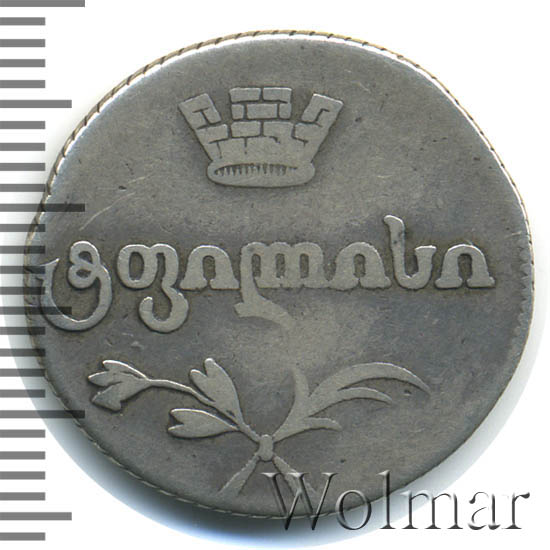 Динамика цен по монете Двойной абаз 1816 АТ „Для Грузии в составе Российской Империи“ XFДвойной абаз 1816 года АТДата выпуска: 01.01.1816 АверсВ центре надпись «თბილისი" (Тбилиси). Над надписью — каменная зубчатая корона (эмблема Тбилиси). Под надписью — перекрещённые пальмовая и оливковая ветви.РеверсВ центре надпись — надпись в две строки: «ქართლი თეთრი" (грузинское серебро). Над надписью грузинская цифра, обозначающая номинал — 400 динаров (40 копеек). Ниже надписи указан год чеканки. Под ним прямая черта. Под чертой буквы «А.Т». Инициалы минцмейстера Александра Трифонова.Каталожные номера